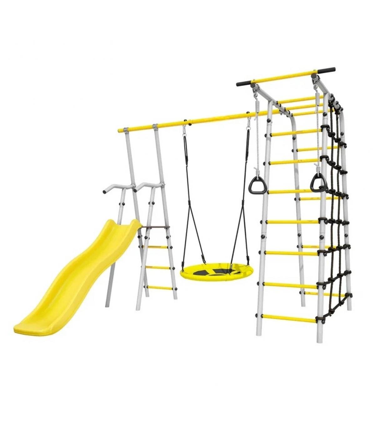 Naujos kartos SANRO HERO-3 sporto kompleksas yra tikras atradimas aktyviems ir judriems vaikams. Puikus pirkinys vasarnamiui, vienkiemui ar privačiam sklypui. Mažasis nuotykių ieškotojas bus tiesiog patenkintas, o tėvai galės grožėtis, kaip vaikas auga, stiprėja ir virsta tikru didvyriu! Komplekse yra patogi ir saugi čiuožykla, šalia kurios yra sūpynės.Kitą komplekso dalį sudaro dvejos vertikalios ir vienos horizontalios gimnastikos kopetėlės, taip pat virvinis tinklas, pagamintas iš didelio stiprumo virvės. Visi priedai pagaminti iš oro sąlygoms atsparių medžiagų - vasarą juos galima palikti lauke. Nuotykis žada būti įdomus! Komplekso struktūra yra tvirta ir gali atlaikyti 100 kg. SANRO HERO-3 yra puikus pasirinkimas tėvams, norintiems, kad šeimos nariai būtų užsiėmę aktyviais žaidimais gamtoje!